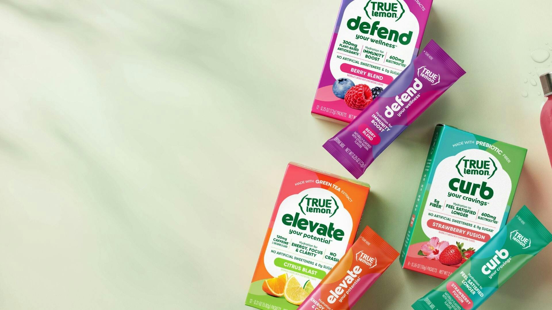 Real ingredients, real science: True Lemon Wellness is a new, exclusive, delicious offering of powerful functional powdered drink mixes that delivers holistic, delicious hydration with purposeful, premium ingredients. Curb is designed to help support you to reduce your appetite and ease hunger pangs during weight management or loss, helpful for anyone on a weight loss journey or a diet, from low-carb to keto. Defend was created to help support overall wellness, immunity and vitality, packed with antioxidants from real fruit extracts. Elevate was designed to be the energy drink in our beverage offering to help with energy, focus & vitality powered by caffeine from green tea but without an energy crash. All of the products contain zero sugar and no artificial sweeteners and all can work synergistically as part of a healthy lifestyle and be a part of a daily wellness routine.